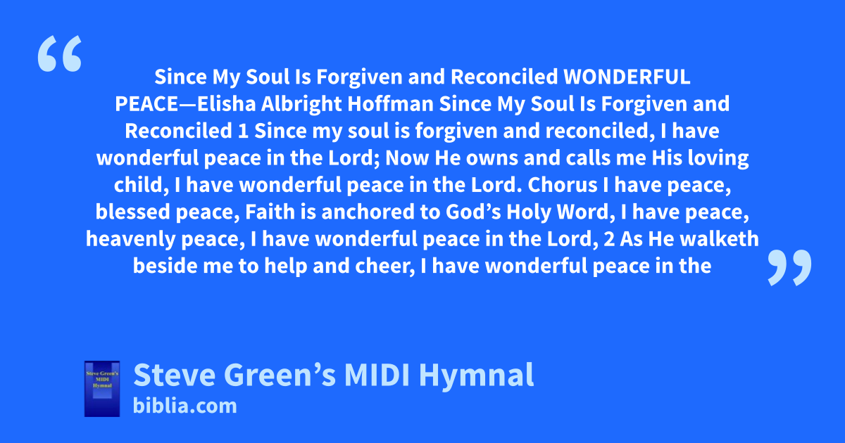 Since My Soul Is Forgiven and Reconciled WONDERFUL PEACE—Elisha Albright Hoffman Since My Soul Is Forgiven and Reconciled 1 Since my soul is forgiven and reconciled, I have wonderful peace in the Lord; Now He owns and calls me His loving child, I have wonderful peace in the Lord. Chorus I have peace, blessed peace, Faith is anchored to God’s Holy Word, I have peace, heavenly peace, I have wonderful peace in the Lord, 2 As He walketh beside me to help and cheer, I have wonderful peace in the