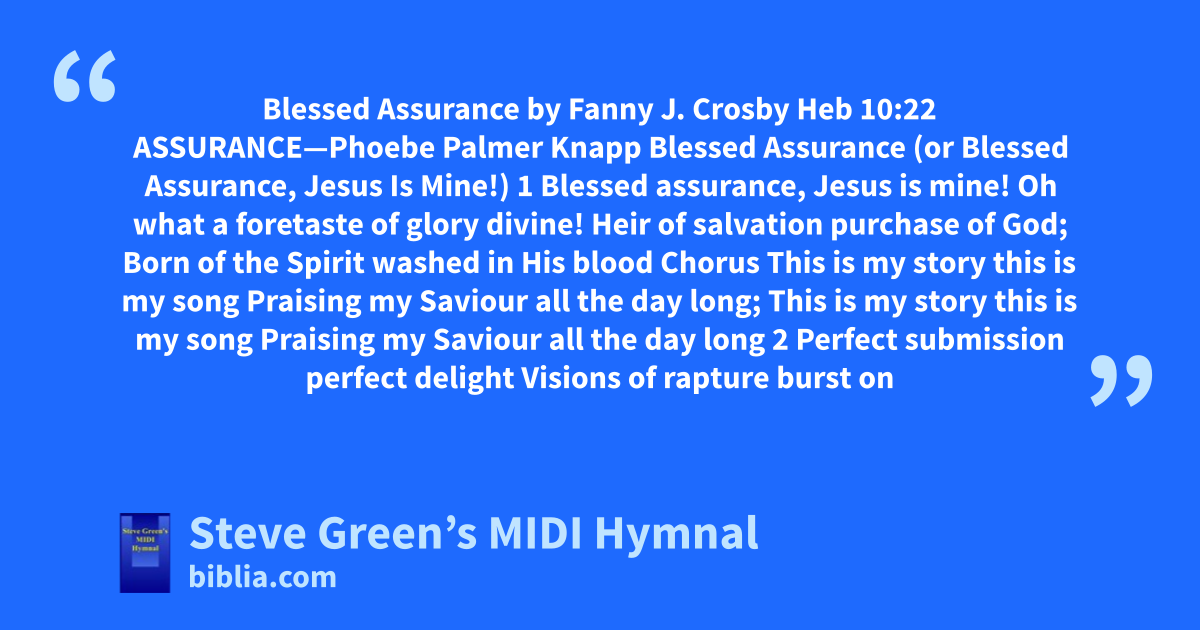 Blessed Assurance by Fanny J. Crosby Heb 10:22 ASSURANCE—Phoebe Palmer Knapp Blessed Assurance (or Blessed Assurance, Jesus Is Mine!) 1 Blessed assurance, Jesus is mine! Oh what a foretaste of glory divine! Heir of salvation purchase of God; Born of the Spirit washed in His blood Chorus This is my story this is my song Praising my Saviour all the day long; This is my story this is my song Praising my Saviour all the day long 2 Perfect submission perfect delight Visions of rapture burst on