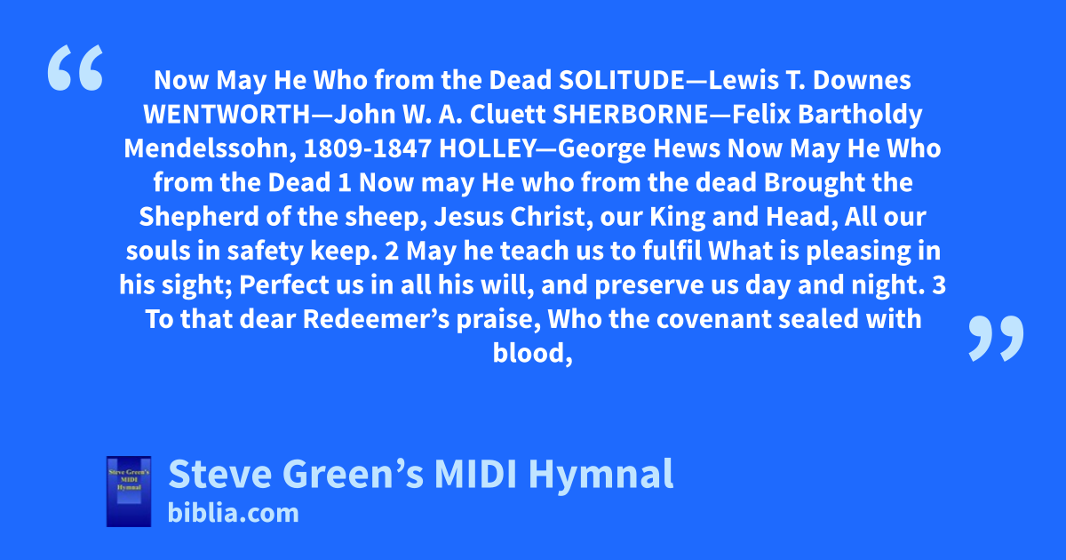 Now May He Who from the Dead SOLITUDE—Lewis T. Downes WENTWORTH—John W. A. Cluett SHERBORNE—Felix Bartholdy Mendelssohn, 1809-1847 HOLLEY—George Hews Now May He Who from the Dead 1 Now may He who from the dead Brought the Shepherd of the sheep, Jesus Christ, our King and Head, All our souls in safety keep. 2 May he teach us to fulfil What is pleasing in his sight; Perfect us in all his will, and preserve us day and night. 3 To that dear Redeemer’s praise, Who the covenant sealed with blood,