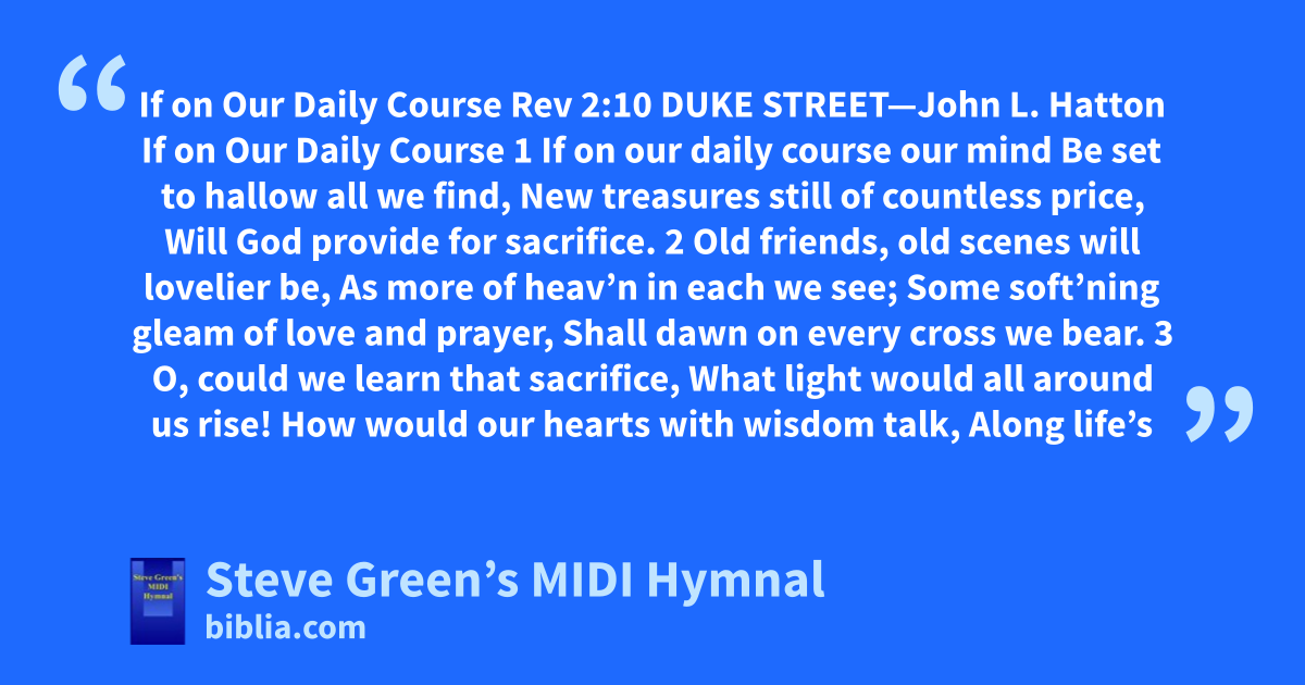 If on Our Daily Course Rev 2:10 DUKE STREET—John L. Hatton If on Our Daily Course 1 If on our daily course our mind Be set to hallow all we find, New treasures still of countless price, Will God provide for sacrifice. 2 Old friends, old scenes will lovelier be, As more of heav’n in each we see; Some soft’ning gleam of love and prayer, Shall dawn on every cross we bear. 3 O, could we learn that sacrifice, What light would all around us rise! How would our hearts with wisdom talk, Along life’s