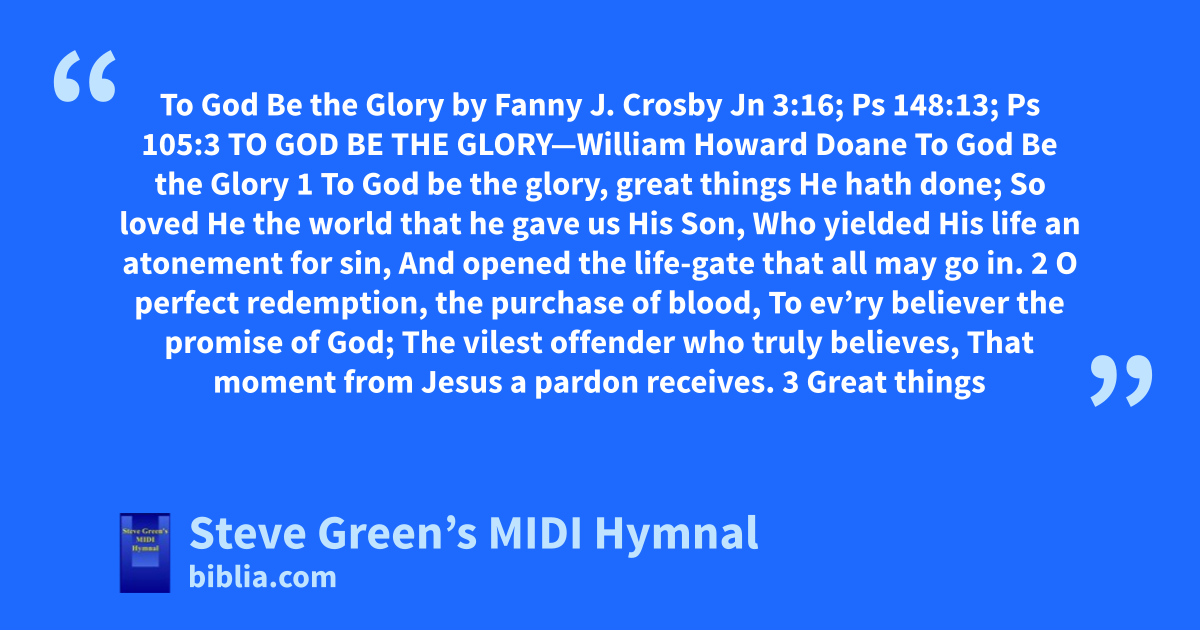 To God Be the Glory by Fanny J. Crosby Jn 3:16; Ps 148:13; Ps 105:3 TO GOD BE THE GLORY—William Howard Doane To God Be the Glory 1 To God be the glory, great things He hath done; So loved He the world that he gave us His Son, Who yielded His life an atonement for sin, And opened the life-gate that all may go in. 2 O perfect redemption, the purchase of blood, To ev’ry believer the promise of God; The vilest offender who truly believes, That moment from Jesus a pardon receives. 3 Great things