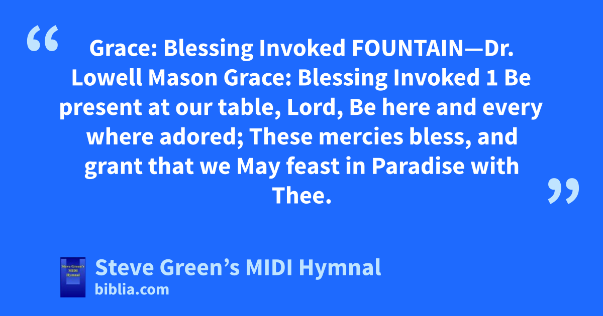 Grace: Blessing Invoked FOUNTAIN—Dr. Lowell Mason Grace: Blessing Invoked 1 Be present at our table, Lord, Be here and every where adored; These mercies bless, and grant that we May feast in Paradise with Thee.
