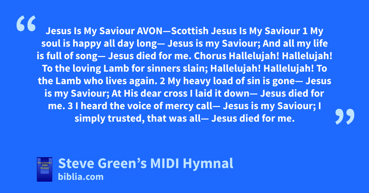 Jesus Is My Saviour AVON—Scottish Jesus Is My Saviour 1 My soul is happy all day long— Jesus is my Saviour; And all my life is full of song— Jesus died for me. Chorus Hallelujah! Hallelujah! To the loving Lamb for sinners slain; Hallelujah! Hallelujah! To the Lamb who lives again. 2 My heavy load of sin is gone— Jesus is my Saviour; At His dear cross I laid it down— Jesus died for me. 3 I heard the voice of mercy call— Jesus is my Saviour; I simply trusted, that was all— Jesus died for me.