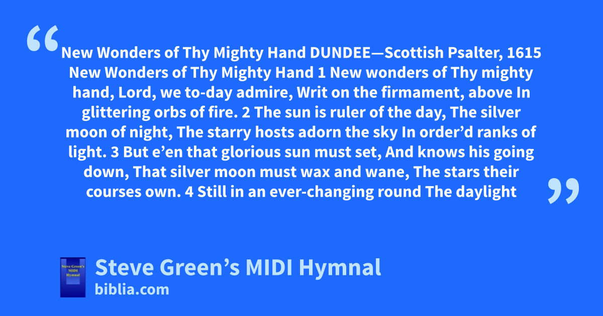 New Wonders of Thy Mighty Hand DUNDEE—Scottish Psalter, 1615 New Wonders of Thy Mighty Hand 1 New wonders of Thy mighty hand, Lord, we to-day admire, Writ on the firmament, above In glittering orbs of fire. 2 The sun is ruler of the day, The silver moon of night, The starry hosts adorn the sky In order’d ranks of light. 3 But e’en that glorious sun must set, And knows his going down, That silver moon must wax and wane, The stars their courses own. 4 Still in an ever-changing round The daylight