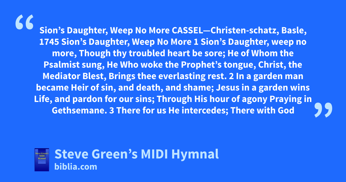 Sion’s Daughter, Weep No More CASSEL—Christen-schatz, Basle, 1745 Sion’s Daughter, Weep No More 1 Sion’s Daughter, weep no more, Though thy troubled heart be sore; He of Whom the Psalmist sung, He Who woke the Prophet’s tongue, Christ, the Mediator Blest, Brings thee everlasting rest. 2 In a garden man became Heir of sin, and death, and shame; Jesus in a garden wins Life, and pardon for our sins; Through His hour of agony Praying in Gethsemane. 3 There for us He intercedes; There with God