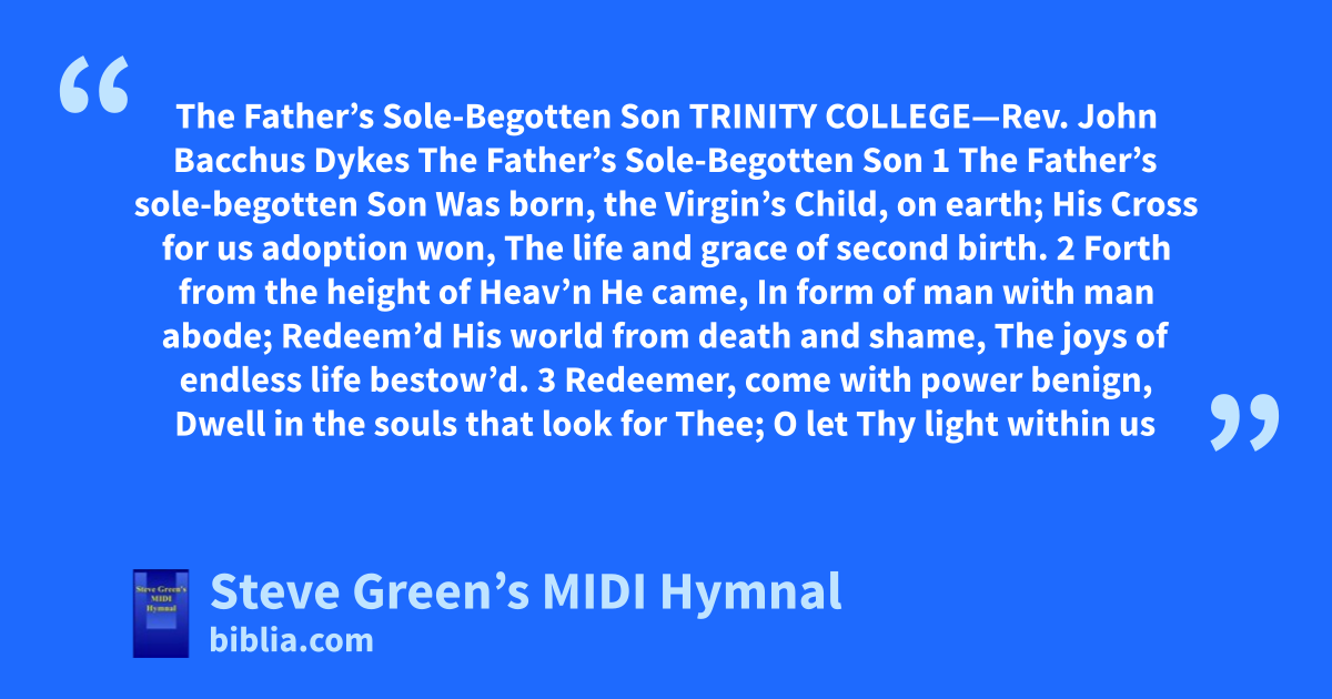 The Father’s Sole-Begotten Son TRINITY COLLEGE—Rev. John Bacchus Dykes The Father’s Sole-Begotten Son 1 The Father’s sole-begotten Son Was born, the Virgin’s Child, on earth; His Cross for us adoption won, The life and grace of second birth. 2 Forth from the height of Heav’n He came, In form of man with man abode; Redeem’d His world from death and shame, The joys of endless life bestow’d. 3 Redeemer, come with power benign, Dwell in the souls that look for Thee; O let Thy light within us