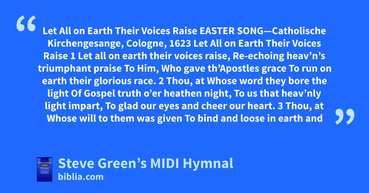 Let All on Earth Their Voices Raise EASTER SONG—Catholische Kirchengesange, Cologne, 1623 Let All on Earth Their Voices Raise 1 Let all on earth their voices raise, Re-echoing heav’n’s triumphant praise To Him, Who gave th’Apostles grace To run on earth their glorious race. 2 Thou, at Whose word they bore the light Of Gospel truth o’er heathen night, To us that heav’nly light impart, To glad our eyes and cheer our heart. 3 Thou, at Whose will to them was given To bind and loose in earth and