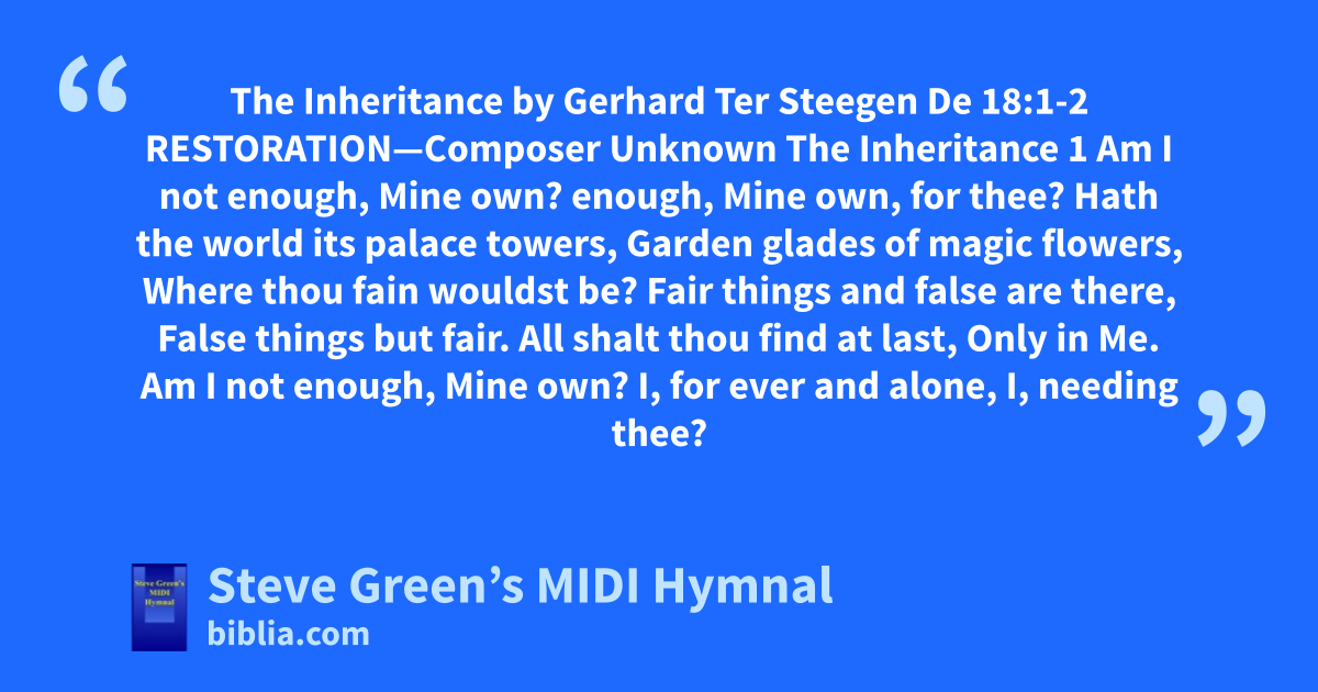 The Inheritance by Gerhard Ter Steegen De 18:1-2 RESTORATION—Composer Unknown The Inheritance 1 Am I not enough, Mine own? enough, Mine own, for thee? Hath the world its palace towers, Garden glades of magic flowers, Where thou fain wouldst be? Fair things and false are there, False things but fair. All shalt thou find at last, Only in Me. Am I not enough, Mine own? I, for ever and alone, I, needing thee?