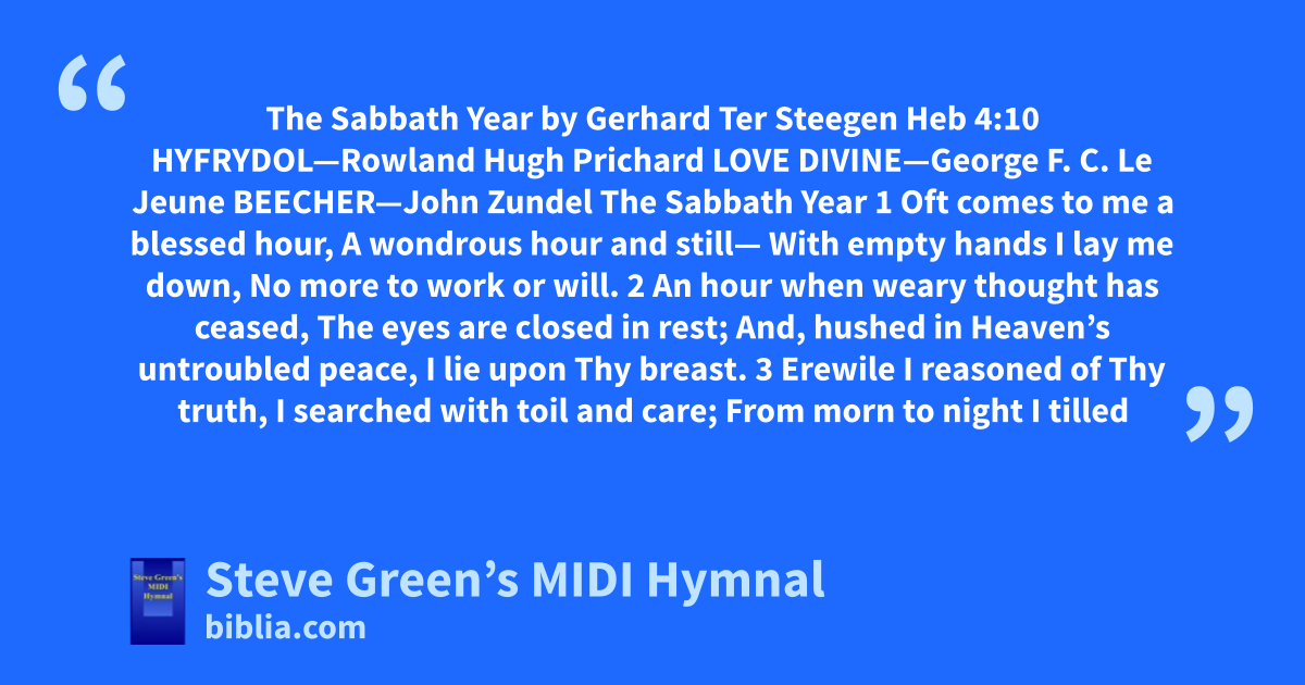 The Sabbath Year by Gerhard Ter Steegen Heb 4:10 HYFRYDOL—Rowland Hugh Prichard LOVE DIVINE—George F. C. Le Jeune BEECHER—John Zundel The Sabbath Year 1 Oft comes to me a blessed hour, A wondrous hour and still— With empty hands I lay me down, No more to work or will. 2 An hour when weary thought has ceased, The eyes are closed in rest; And, hushed in Heaven’s untroubled peace, I lie upon Thy breast. 3 Erewile I reasoned of Thy truth, I searched with toil and care; From morn to night I tilled