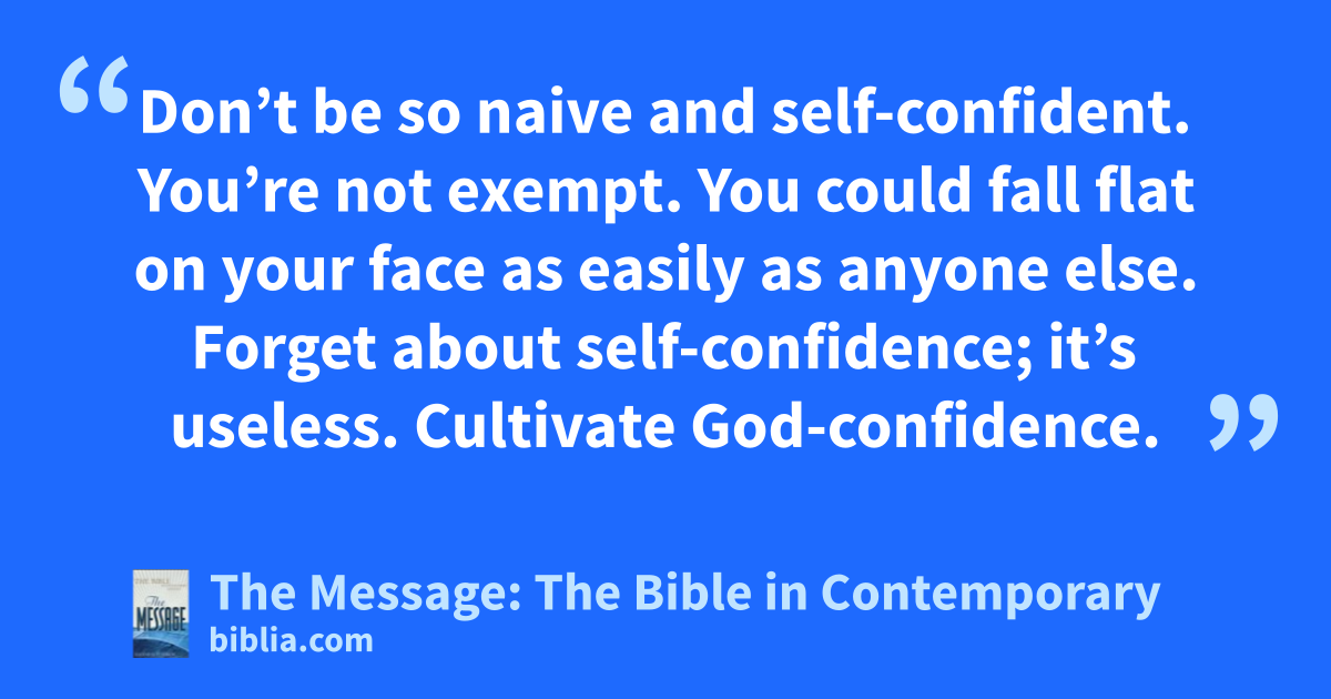 11–12 These are all warning markers—danger!—in our history books, written down so that we don’t repeat their mistakes. Our positions in the story are parallel—they at the beginning, we at the end—and we are just as capable of messing it up as they were. Don’t be so naive and self-confident. You’re not exempt. You could fall flat on your face as easily as anyone else. Forget about self-confidence; it’s useless. Cultivate God-confidence.