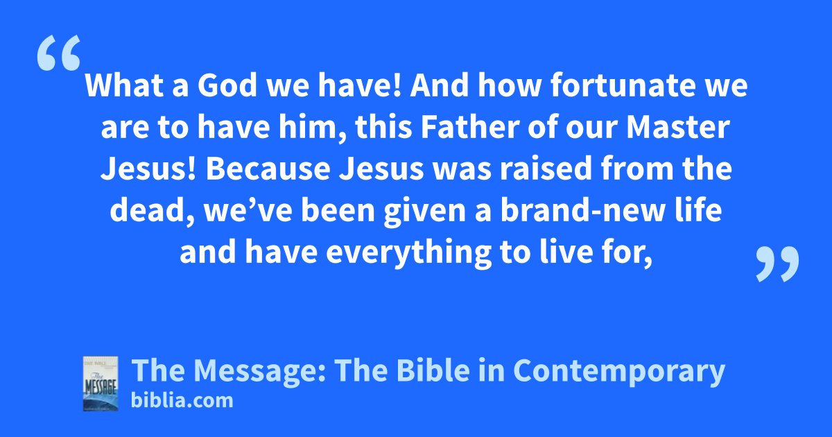 3–5 What a God we have! And how fortunate we are to have him, this Father of our Master Jesus! Because Jesus was raised from the dead, we’ve been given a brand-new life and have everything to live for, including a future in heaven—and the future starts now! God is keeping careful watch over us and the future. The Day is coming when you’ll have it all—life healed and whole.