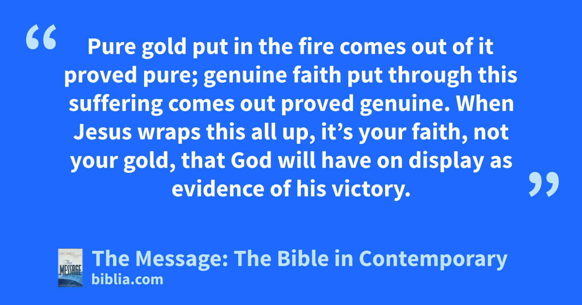 6–7 I know how great this makes you feel, even though you have to put up with every kind of aggravation in the meantime. Pure gold put in the fire comes out of it proved pure; genuine faith put through this suffering comes out proved genuine. When Jesus wraps this all up, it’s your faith, not your gold, that God will have on display as evidence of his victory.