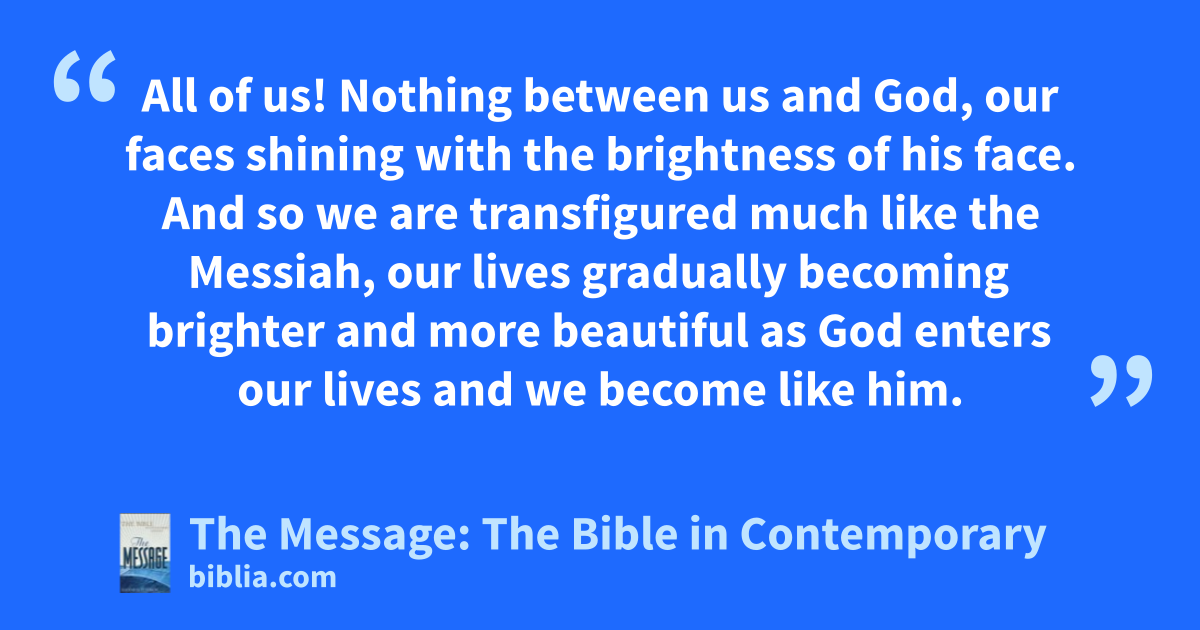 16–18 Whenever, though, they turn to face God as Moses did, God removes the veil and there they are—face-to-face! They suddenly recognize that God is a living, personal presence, not a piece of chiseled stone. And when God is personally present, a living Spirit, that old, constricting legislation is recognized as obsolete. We’re free of it! All of us! Nothing between us and God, our faces shining with the brightness of his face. And so we are transfigured much like the Messiah, our lives gradually becoming brighter and more beautiful as God enters our lives and we become like him.