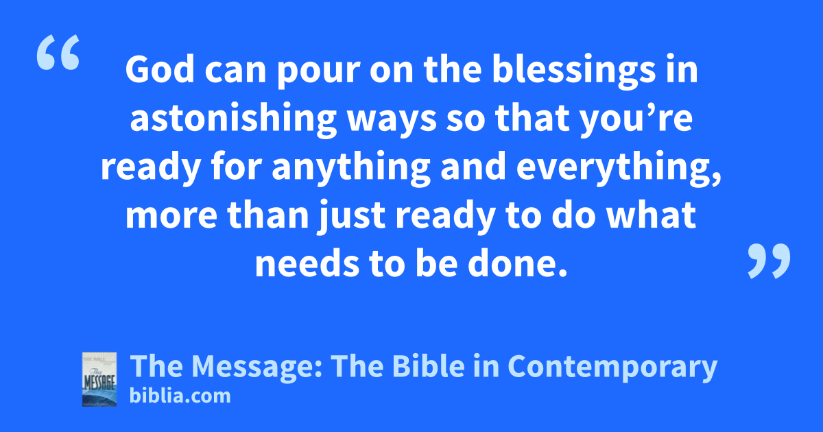 8–11 God can pour on the blessings in astonishing ways so that you’re ready for anything and everything, more than just ready to do what needs to be done. As one psalmist puts it,