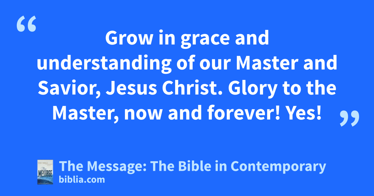 17–18 But you, friends, are well-warned. Be on guard lest you lose your footing and get swept off your feet by these lawless and loose-talking teachers. Grow in grace and understanding of our Master and Savior, Jesus Christ.