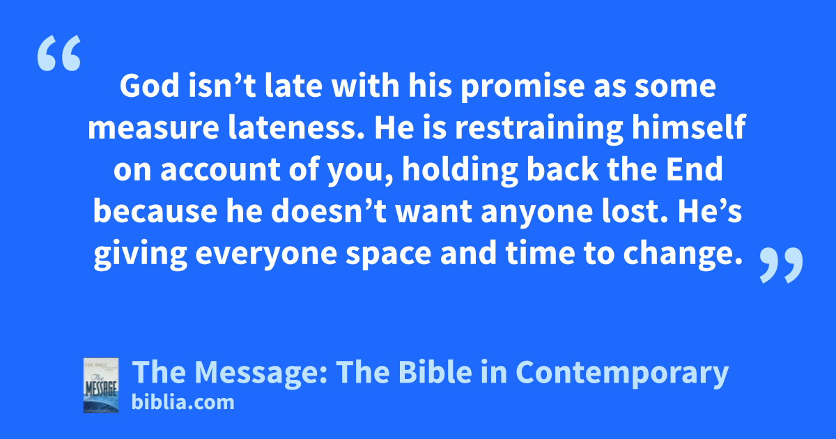 8–9 Don’t overlook the obvious here, friends. With God, one day is as good as a thousand years, a thousand years as a day. God isn’t late with his promise as some measure lateness. He is restraining himself on account of you, holding back the End because he doesn’t want anyone lost. He’s giving everyone space and time to change.