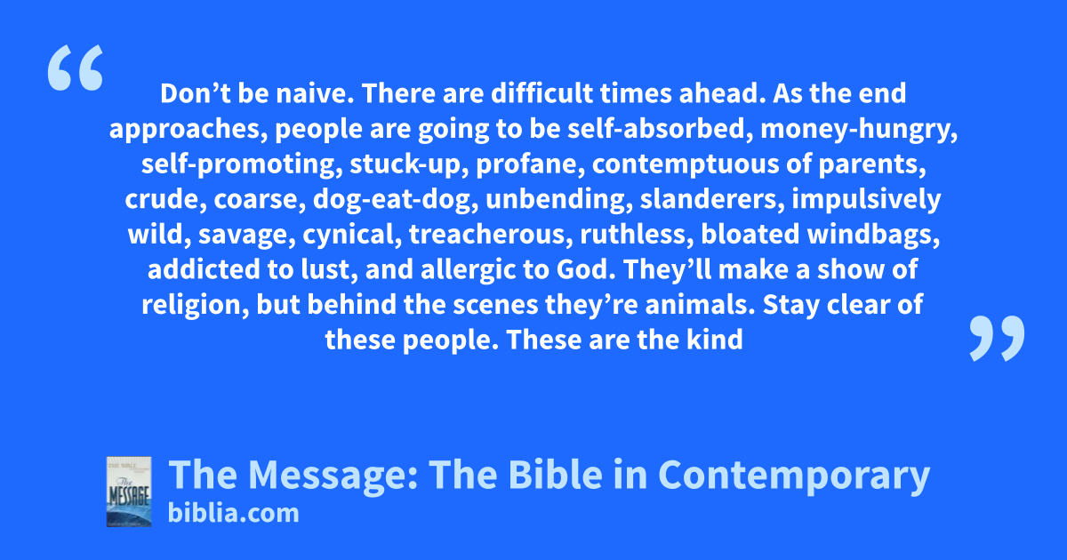 1–5 3 Don’t be naive. There are difficult times ahead. As the end approaches, people are going to be self-absorbed, money-hungry, self-promoting, stuck-up, profane, contemptuous of parents, crude, coarse, dog-eat-dog, unbending, slanderers, impulsively wild, savage, cynical, treacherous, ruthless, bloated windbags, addicted to lust, and allergic to God. They’ll make a show of religion, but behind the scenes they’re animals. Stay clear of these people.