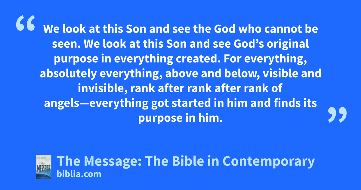 15–18 We look at this Son and see the God who cannot be seen. We look at this Son and see God’s original purpose in everything created. For everything, absolutely everything, above and below, visible and invisible, rank after rank after rank of angels—everything got started in him and finds its purpose in him. He was there before any of it came into existence and holds it all together right up to this moment. And when it comes to the church, he organizes and holds it together, like a head does a body.