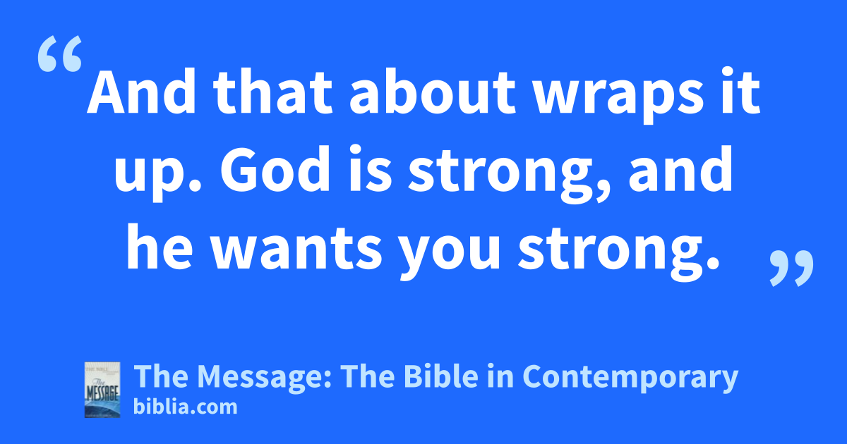 10–12 And that about wraps it up. God is strong, and he wants you strong. So take everything the Master has set out for you, well-made weapons of the best materials. And put them to use so you will be able to stand up to everything the Devil throws your way. This is no afternoon athletic contest that we’ll walk away from and forget about in a couple of hours. This is for keeps, a life-or-death fight to the finish against the Devil and all his angels.