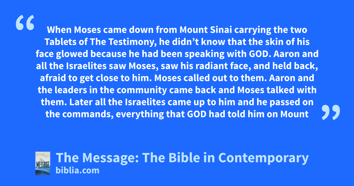 29–30 When Moses came down from Mount Sinai carrying the two Tablets of The Testimony, he didn’t know that the skin of his face glowed because he had been speaking with God. Aaron and all the Israelites saw Moses, saw his radiant face, and held back, afraid to get close to him.
