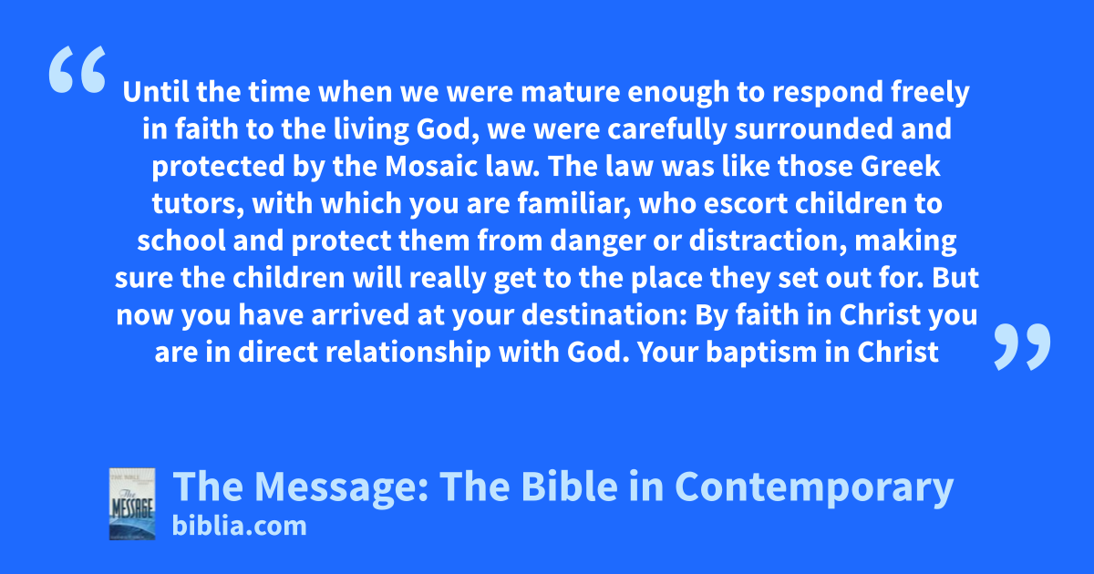 23–24 Until the time when we were mature enough to respond freely in faith to the living God, we were carefully surrounded and protected by the Mosaic law. The law was like those Greek tutors, with which you are familiar, who escort children to school and protect them from danger or distraction, making sure the children will really get to the place they set out for.