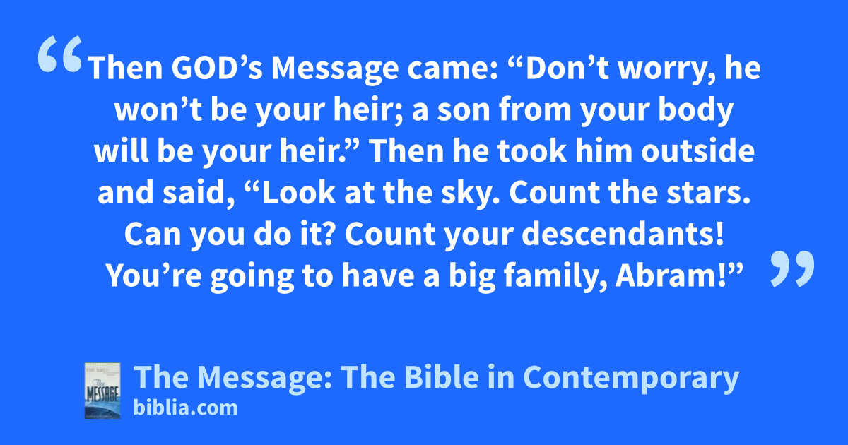 5 Then he took him outside and said, “Look at the sky. Count the stars. Can you do it? Count your descendants! You’re going to have a big family, Abram!”