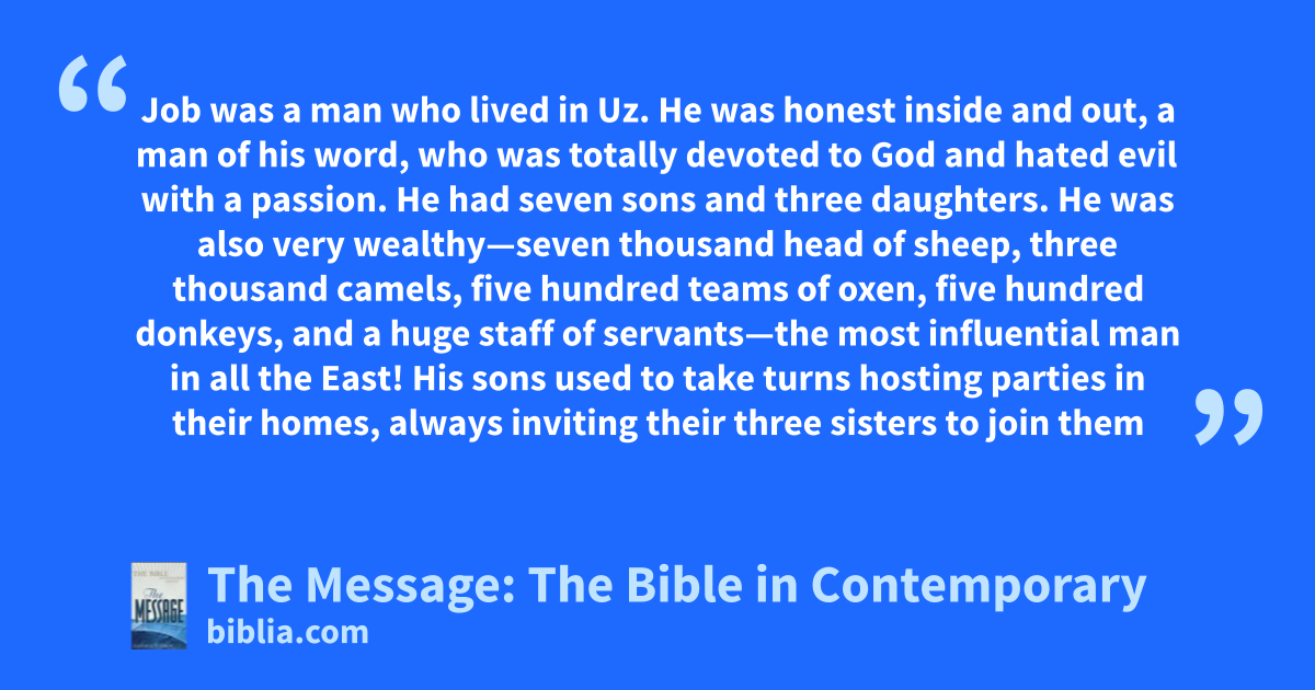 1–3 1 Job was a man who lived in Uz. He was honest inside and out, a man of his word, who was totally devoted to God and hated evil with a passion. He had seven sons and three daughters. He was also very wealthy—seven thousand head of sheep, three thousand camels, five hundred teams of oxen, five hundred donkeys, and a huge staff of servants—the most influential man in all the East!