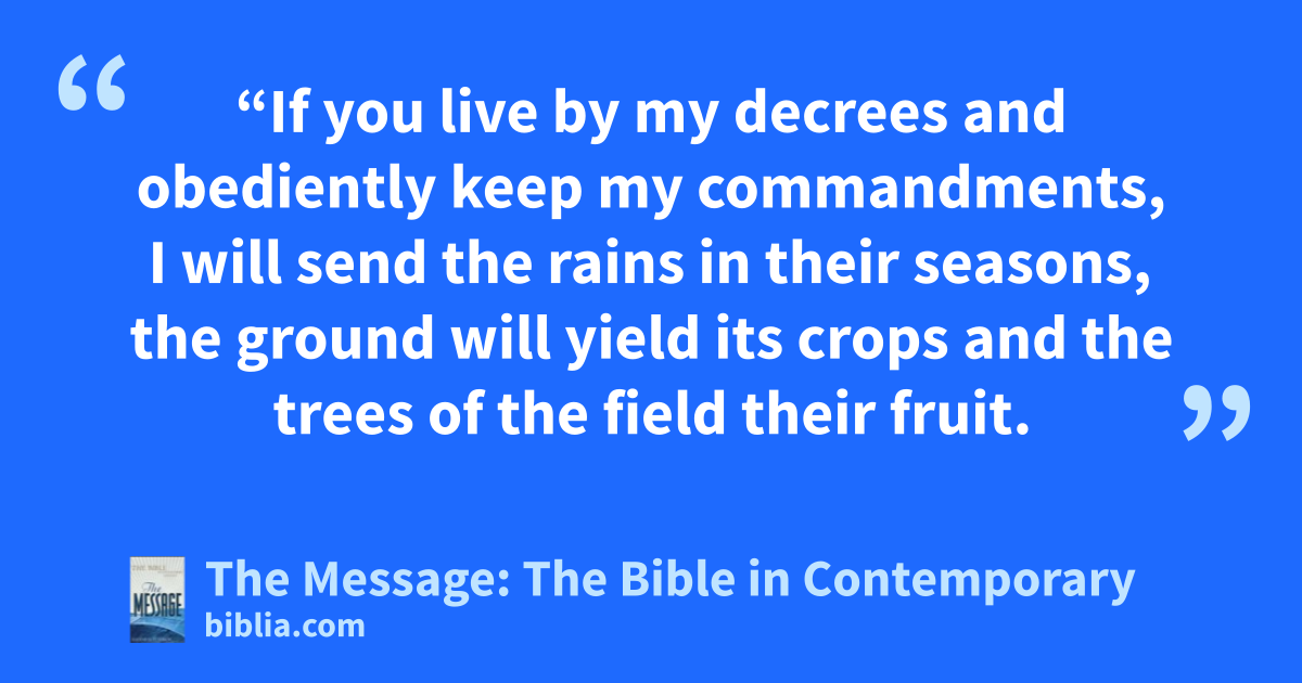3–5 “If you live by my decrees and obediently keep my commandments, I will send the rains in their seasons, the ground will yield its crops and the trees of the field their fruit. You will thresh until the grape harvest and the grape harvest will continue until planting time; you’ll have more than enough to eat and will live safe and secure in your land.