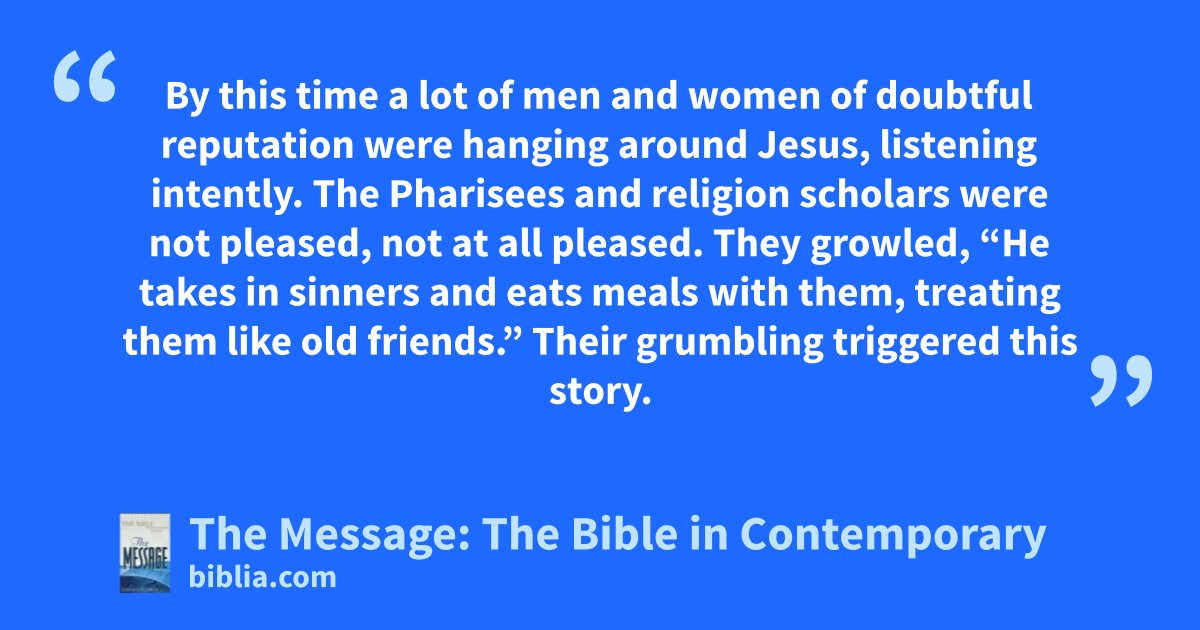1–3 15 By this time a lot of men and women of doubtful reputation were hanging around Jesus, listening intently. The Pharisees and religion scholars were not pleased, not at all pleased. They growled, “He takes in sinners and eats meals with them, treating them like old friends.” Their grumbling triggered this story.