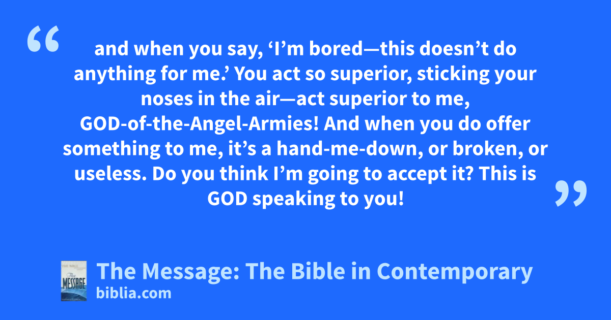 12–13 “All except you. Instead of honoring me, you profane me. You profane me when you say, ‘Worship is not important, and what we bring to worship is of no account,’ and when you say, ‘I’m bored—this doesn’t do anything for me.’ You act so superior, sticking your noses in the air—act superior to me, God-of-the-Angel-Armies! And when you do offer something to me, it’s a hand-me-down, or broken, or useless. Do you think I’m going to accept it? This is God speaking to you!