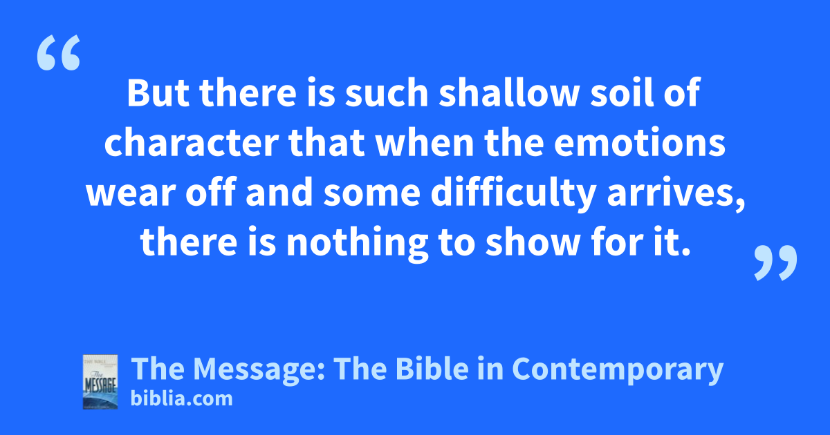 16–17 “And some are like the seed that lands in the gravel. When they first hear the Word, they respond with great enthusiasm. But there is such shallow soil of character that when the emotions wear off and some difficulty arrives, there is nothing to show for it.
