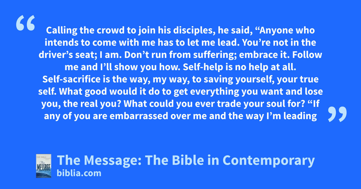 34–37 Calling the crowd to join his disciples, he said, “Anyone who intends to come with me has to let me lead. You’re not in the driver’s seat; I am. Don’t run from suffering; embrace it. Follow me and I’ll show you how. Self-help is no help at all. Self-sacrifice is the way, my way, to saving yourself, your true self. What good would it do to get everything you want and lose you, the real you? What could you ever trade your soul for?