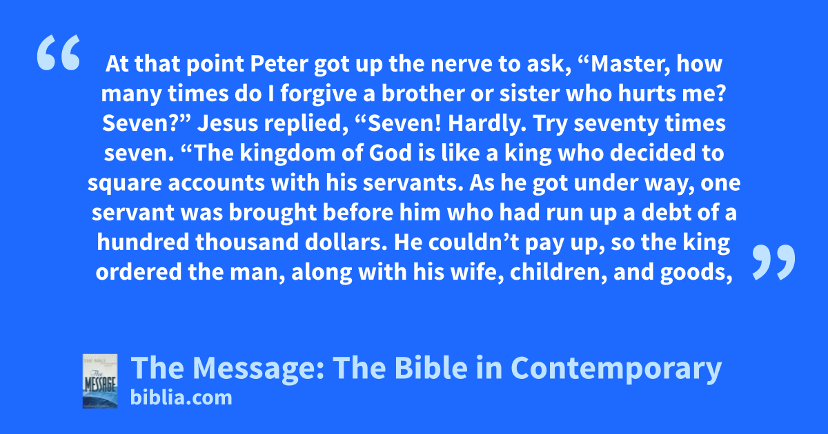 32–35 “The king summoned the man and said, ‘You evil servant! I forgave your entire debt when you begged me for mercy. Shouldn’t you be compelled to be merciful to your fellow servant who asked for mercy?’ The king was furious and put the screws to the man until he paid back his entire debt. And that’s exactly what my Father in heaven is going to do to each one of you who doesn’t forgive unconditionally anyone who asks for mercy.”