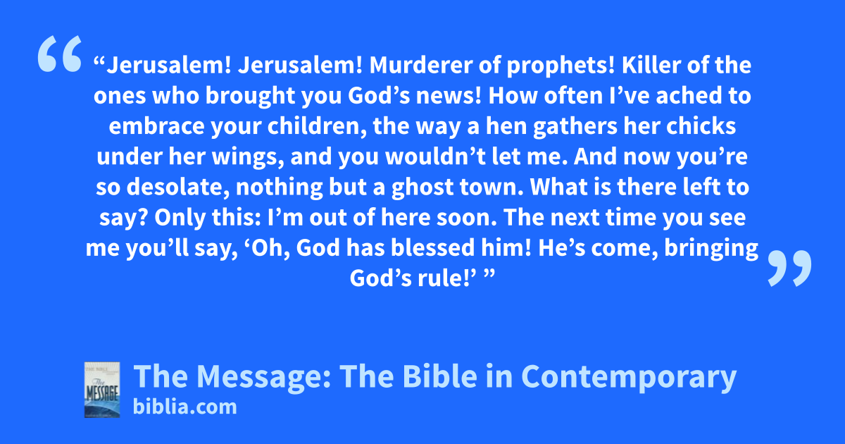37–39 “Jerusalem! Jerusalem! Murderer of prophets! Killer of the ones who brought you God’s news! How often I’ve ached to embrace your children, the way a hen gathers her chicks under her wings, and you wouldn’t let me. And now you’re so desolate, nothing but a ghost town. What is there left to say? Only this: I’m out of here soon. The next time you see me you’ll say, ‘Oh, God has blessed him! He’s come, bringing God’s rule!’ ”