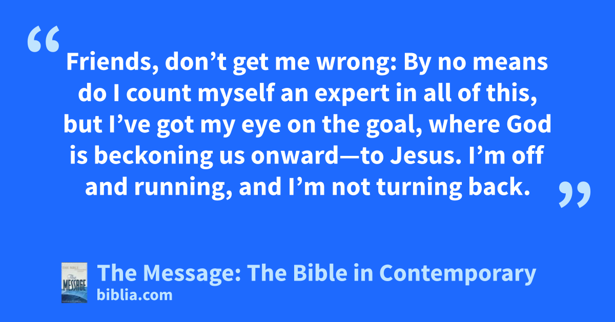 12–14 I’m not saying that I have this all together, that I have it made. But I am well on my way, reaching out for Christ, who has so wondrously reached out for me. Friends, don’t get me wrong: By no means do I count myself an expert in all of this, but I’ve got my eye on the goal, where God is beckoning us onward—to Jesus. I’m off and running, and I’m not turning back.