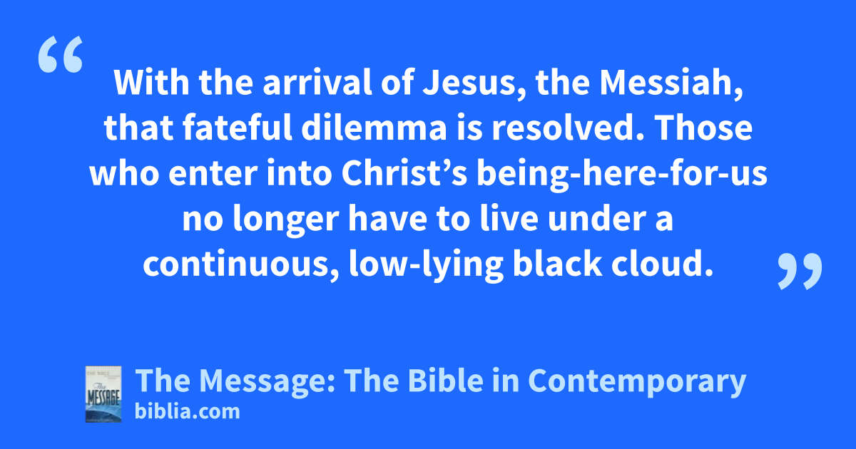 1–2 8 With the arrival of Jesus, the Messiah, that fateful dilemma is resolved. Those who enter into Christ’s being-here-for-us no longer have to live under a continuous, low-lying black cloud. A new power is in operation. The Spirit of life in Christ, like a strong wind, has magnificently cleared the air, freeing you from a fated lifetime of brutal tyranny at the hands of sin and death.