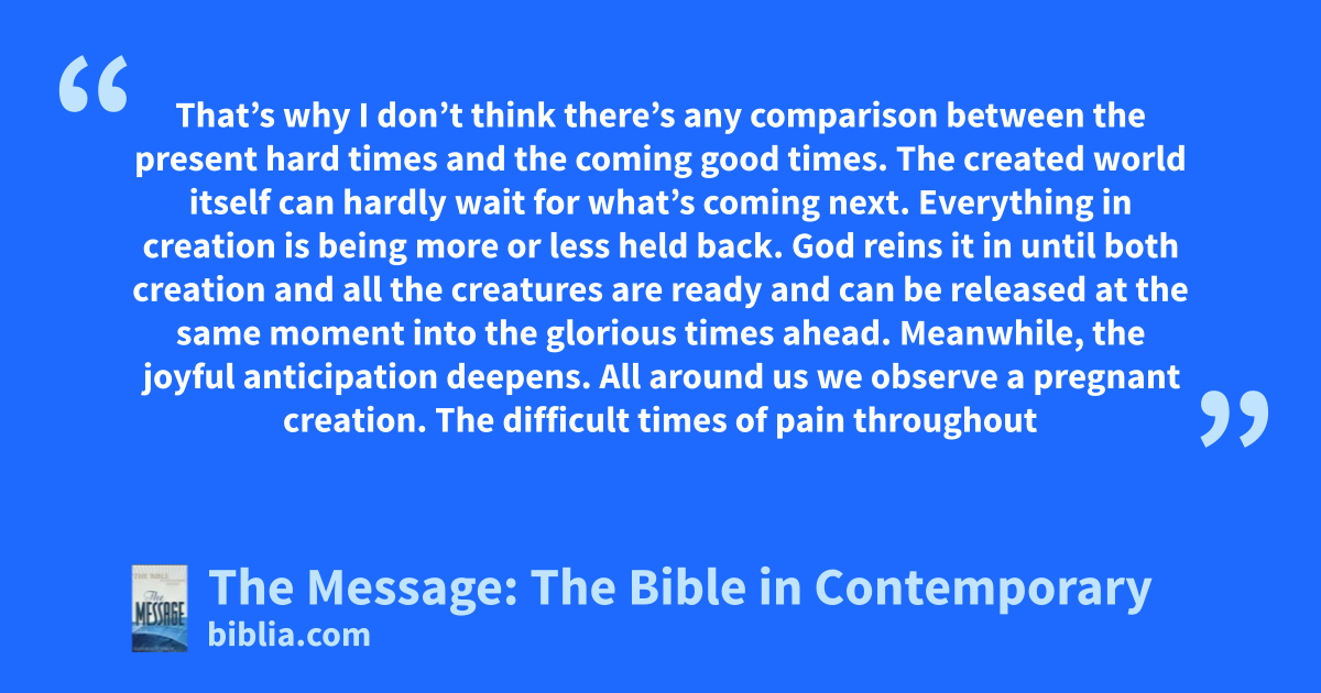 18–21 That’s why I don’t think there’s any comparison between the present hard times and the coming good times. The created world itself can hardly wait for what’s coming next. Everything in creation is being more or less held back. God reins it in until both creation and all the creatures are ready and can be released at the same moment into the glorious times ahead. Meanwhile, the joyful anticipation deepens.