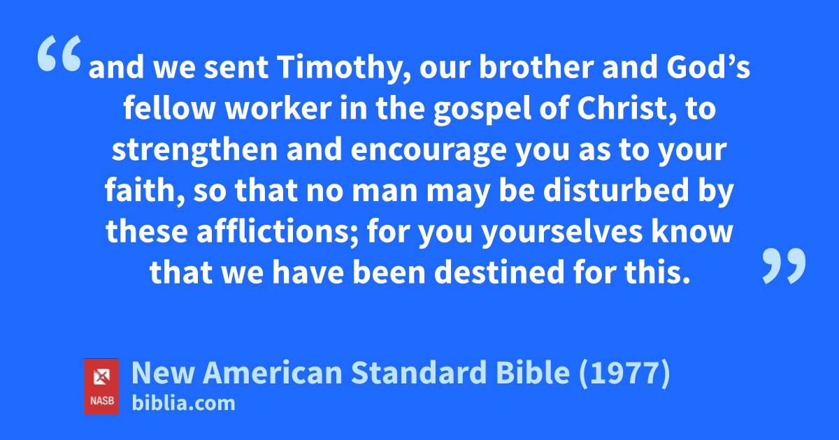 and we sent Timothy, our brother and God’s fellow worker in the gospel of Christ, to strengthen and encourage you as to your faith, so that no man may be disturbed by these afflictions; for you yourselves know that we have been destined for this.