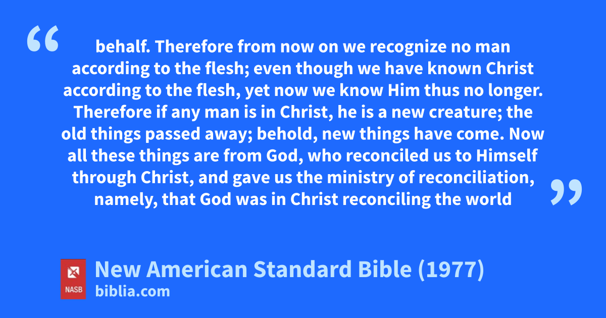 behalf. Therefore from now on we recognize no man according to the flesh; even though we have known Christ according to the flesh, yet now we know Him thus no longer. Therefore if any man is in Christ, he is a new creature; the old things passed away; behold, new things have come. Now all these things are from God, who reconciled us to Himself through Christ, and gave us the ministry of reconciliation, namely, that God was in Christ reconciling the world