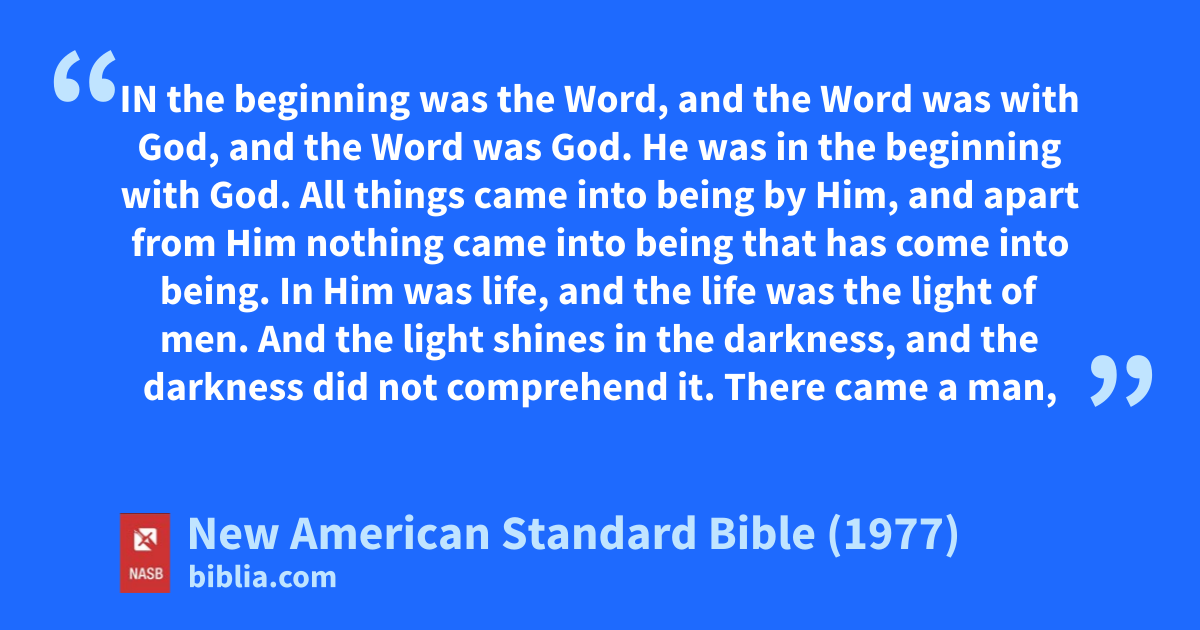 IN the beginning was the Word, and the Word was with God, and the Word was God. He was in the beginning with God. All things came into being by Him, and apart from Him nothing came into being that has come into being. In Him was life, and the life was the light of men. And the light shines in the darkness, and the darkness did not comprehend it. There came a man,