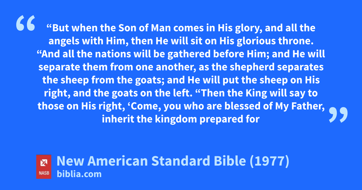 “But when the Son of Man comes in His glory, and all the angels with Him, then He will sit on His glorious throne. “And all the nations will be gathered before Him; and He will separate them from one another, as the shepherd separates the sheep from the goats; and He will put the sheep on His right, and the goats on the left. “Then the King will say to those on His right, ‘Come, you who are blessed of My Father, inherit the kingdom prepared for