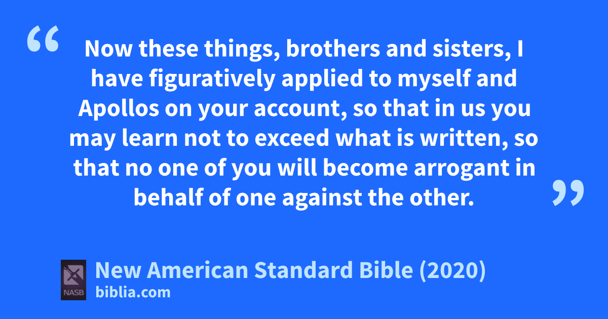 Now these things, brothers and sisters, I have figuratively applied to myself and Apollos on your account, so that in us you may learn not to exceed what is written, so that no one of you will become arrogant in behalf of one against the other.