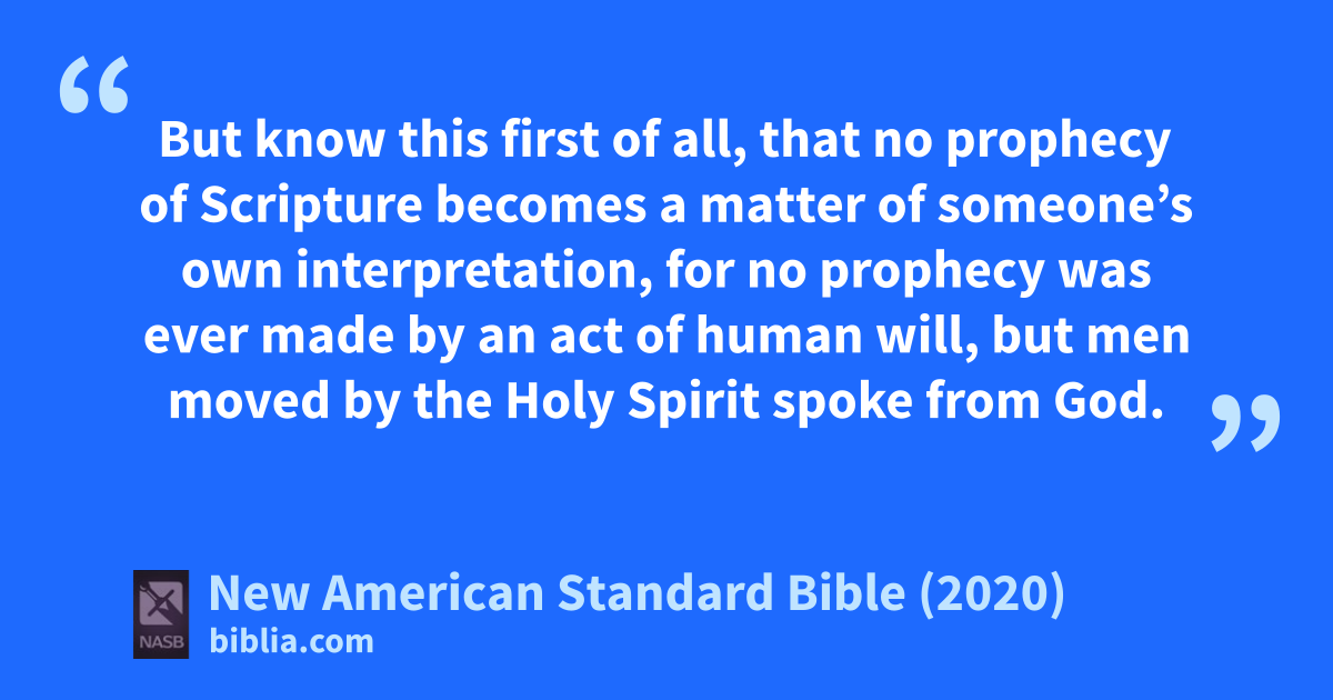 But know this first of all, that no prophecy of Scripture becomes a matter of someone’s own interpretation, for no prophecy was ever made by an act of human will, but men moved by the Holy Spirit spoke from God.