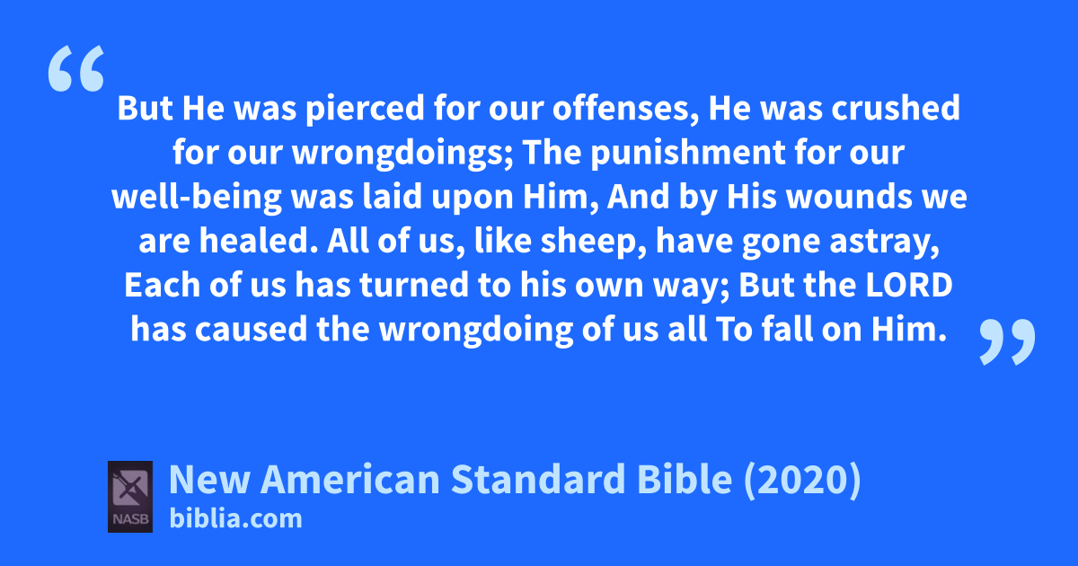 But He was pierced for our offenses, He was crushed for our wrongdoings; The punishment for our well-being was laid upon Him, And by His wounds we are healed. All of us, like sheep, have gone astray, Each of us has turned to his own way; But the LORD has caused the wrongdoing of us all To fall on Him.