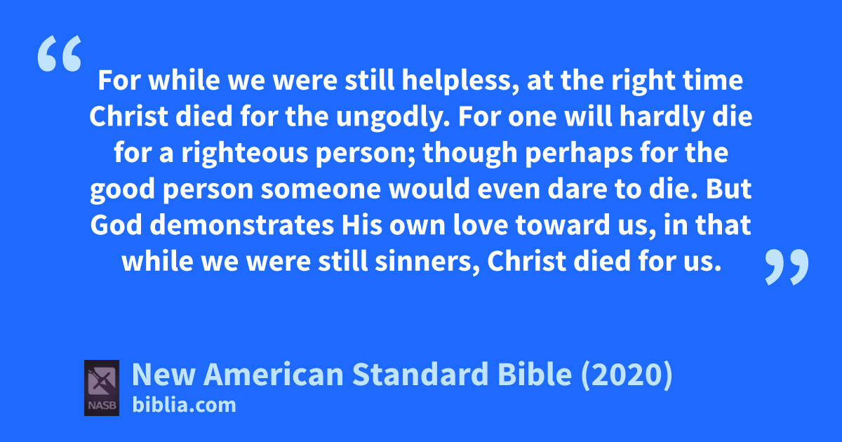 For while we were still helpless, at the right time Christ died for the ungodly. For one will hardly die for a righteous person; though perhaps for the good person someone would even dare to die. But God demonstrates His own love toward us, in that while we were still sinners, Christ died for us.