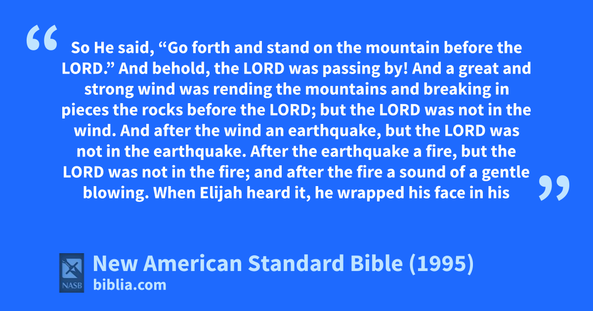 11 So He said, “aGo forth and stand on the mountain before the Lord.” And behold, the Lord was passing by! And ba great and strong wind was rending the mountains and breaking in pieces the rocks before the Lord; but the Lord was not in the wind. And after the wind an earthquake, but the Lord was not in the earthquake.
