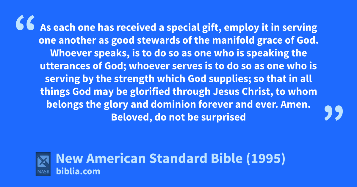 11 aWhoever speaks, is to do so 1as one who is speaking the butterances of God; whoever serves is to do so as one who is serving 2cby the strength which God supplies; so that din all things God may be glorified through Jesus Christ, eto whom belongs the glory and dominion forever and ever. Amen.