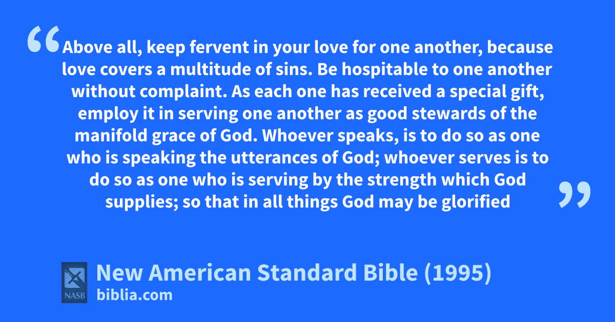 11 aWhoever speaks, is to do so 1as one who is speaking the butterances of God; whoever serves is to do so as one who is serving 2cby the strength which God supplies; so that din all things God may be glorified through Jesus Christ, eto whom belongs the glory and dominion forever and ever. Amen.