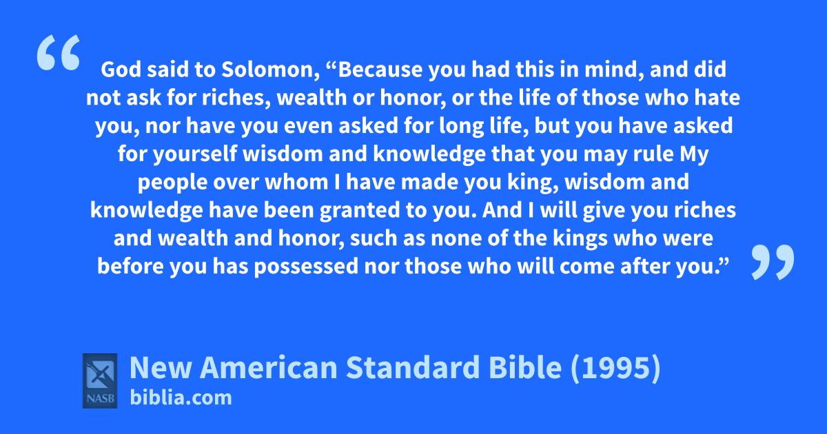 12 wisdom and knowledge have been granted to you. And aI will give you riches and wealth and honor, 1such as none of the kings who were before you has possessed nor those who will 2come after you.”