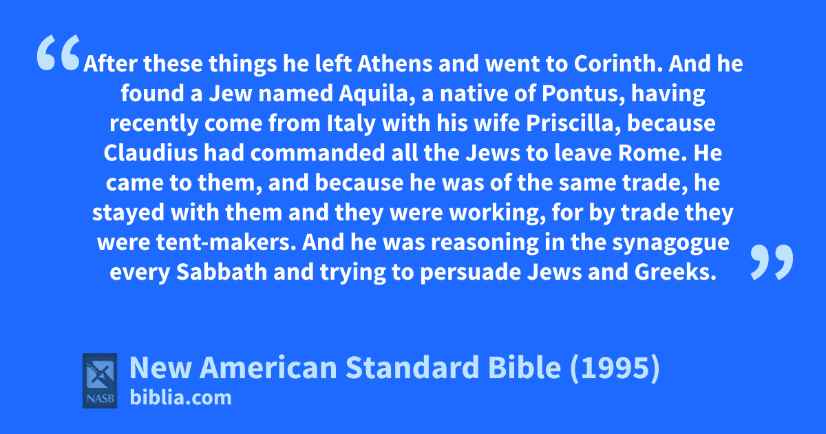 2 And he found a Jew named aAquila, a native of bPontus, having recently come from cItaly with his wife aPriscilla, because dClaudius had commanded all the Jews to leave Rome. He came to them,